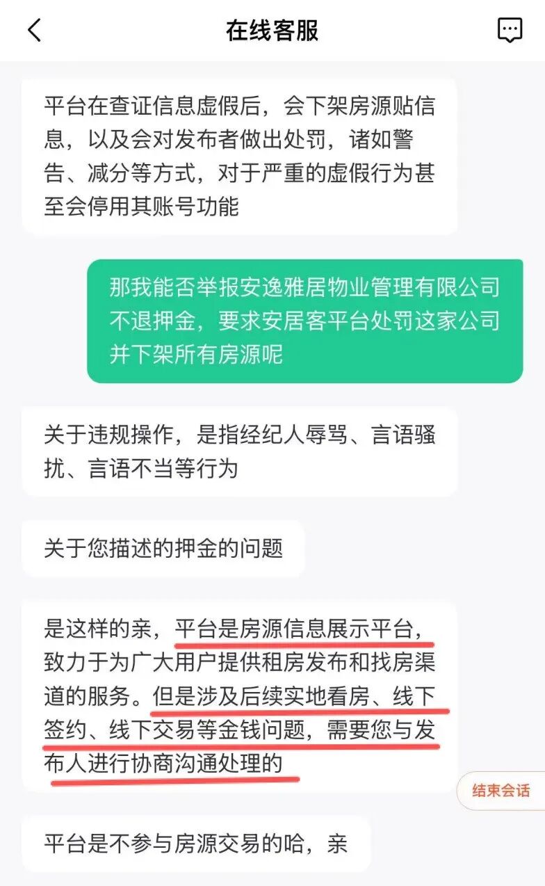 北京商报记者近日接到租客刘芳投诉,她通过安居客平台上入驻的中介公司承租北京大兴区一套一居室后,陷入了一场持续近一年的租房维权拉锯战:平台推荐的企业安逸雅居(北京)物业管理有限公司(以下简称“安逸雅居”)以个人账户收取房租近4.6万元,租赁期满后却拖欠押金拒不退还。房东上门“赶客”,声称未收到安逸雅居的租金。一场由平台搭桥、黑中介两边吃的租房“顽疾”再次上演。而租房前大讲品牌背书和“租住保障”的平台,在问题发生后以“纠纷属于线下交易”为由,拒绝履行任何监管或协助义务。
