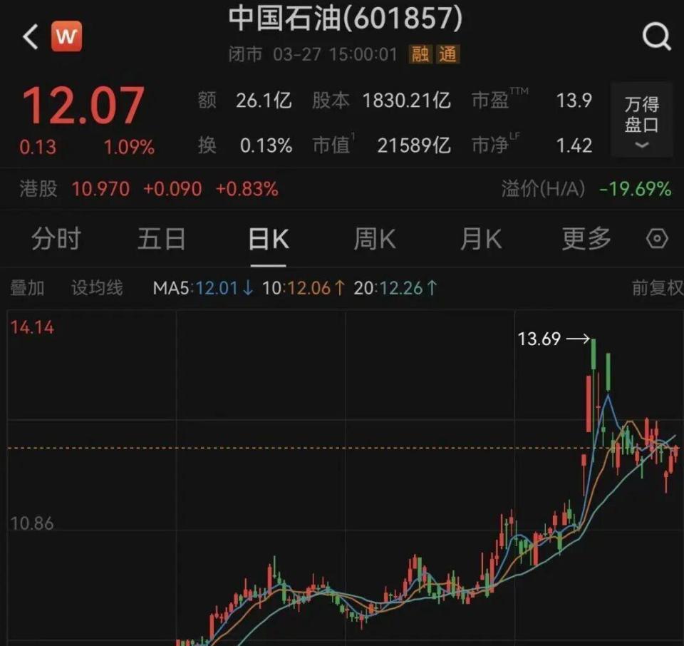 利润数字往下走,市场反应却往上蹿。 近一年股价涨超50%,今年头三个月又冲高15%。 3月27日收盘12.07元,总市值2.21万亿。