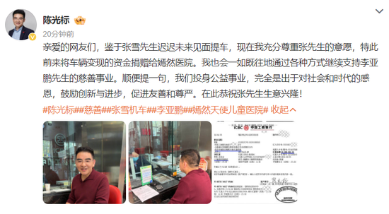 4月5日,陈光标发文:鉴于张雪先生迟迟未来见面提车,现在我充分尊重张先生的意愿,特此前来将车辆变现的资金捐赠给嫣然医院。我也会一如既往地通过各种方式继续支持李亚鹏先生的慈善事业。顺便提一句,我们投身公益事业,完全是出于对社会和时代的感恩,鼓励创新与进步,促进友善和尊严。在此恭祝张先生生意兴隆!