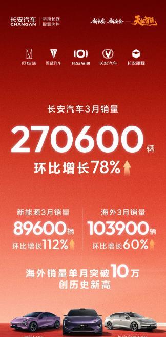 4月1日,重庆长安汽车股份有限公司(简称:长安汽车)公布最新销量成绩:3月销量达270600辆,环比增长78%,展现出新央企的增长韧性和发展势能。其中,新能源和海外市场双线告捷——当月新能源销量89600辆,环比增长高达112%;海外销量103900辆,环比增长60%,创历史新高——双双成为拉动增长的强劲引擎。